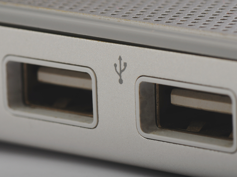 Les ports USB, HDMI et autres connexions attirent facilement la poussière et les miettes. Utilisez ici aussi une bombe d’air comprimé. Pulvérisez brièvement dans le port et vérifiez si des saletés en sortent.