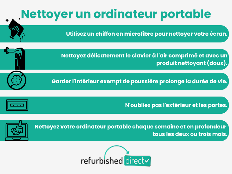 Nettoyer votre ordinateur portable, ce n’est pas du luxe. Un entretien régulier permet de prévenir les pannes, prolonger la durée de vie de l’appareil et de travailler dans de meilleures conditions d’hygiène. À retenir :