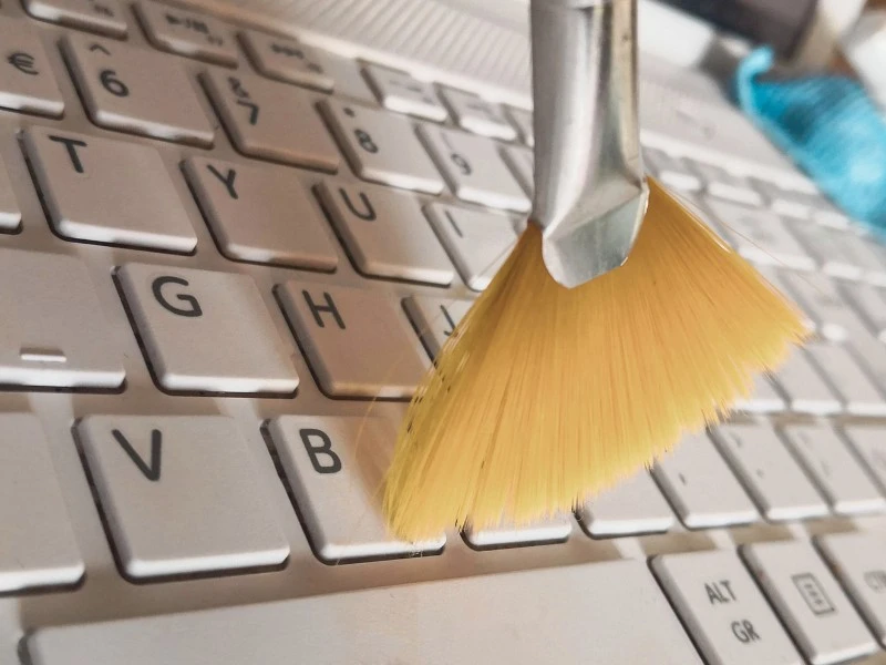 - Éliminer la poussière et les saletés : Utilisez une brosse douce ou une bombe d’air comprimé pour souffler la poussière et les miettes. Soufflez en biais sous les touches, pour que la saleté soit expulsée et non enfoncée.